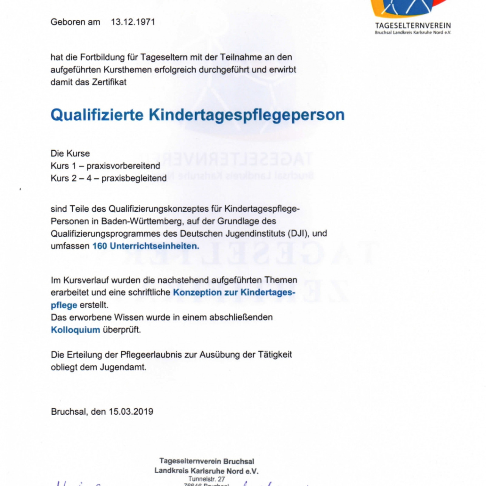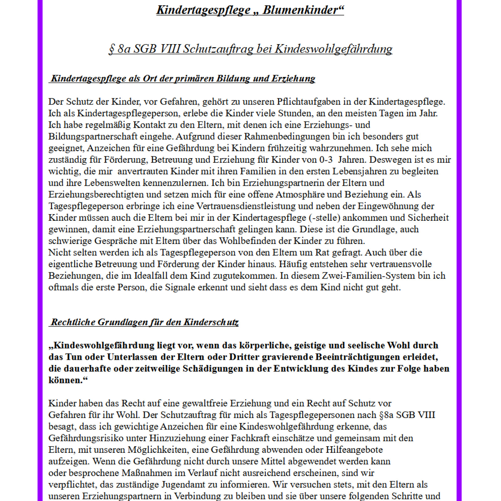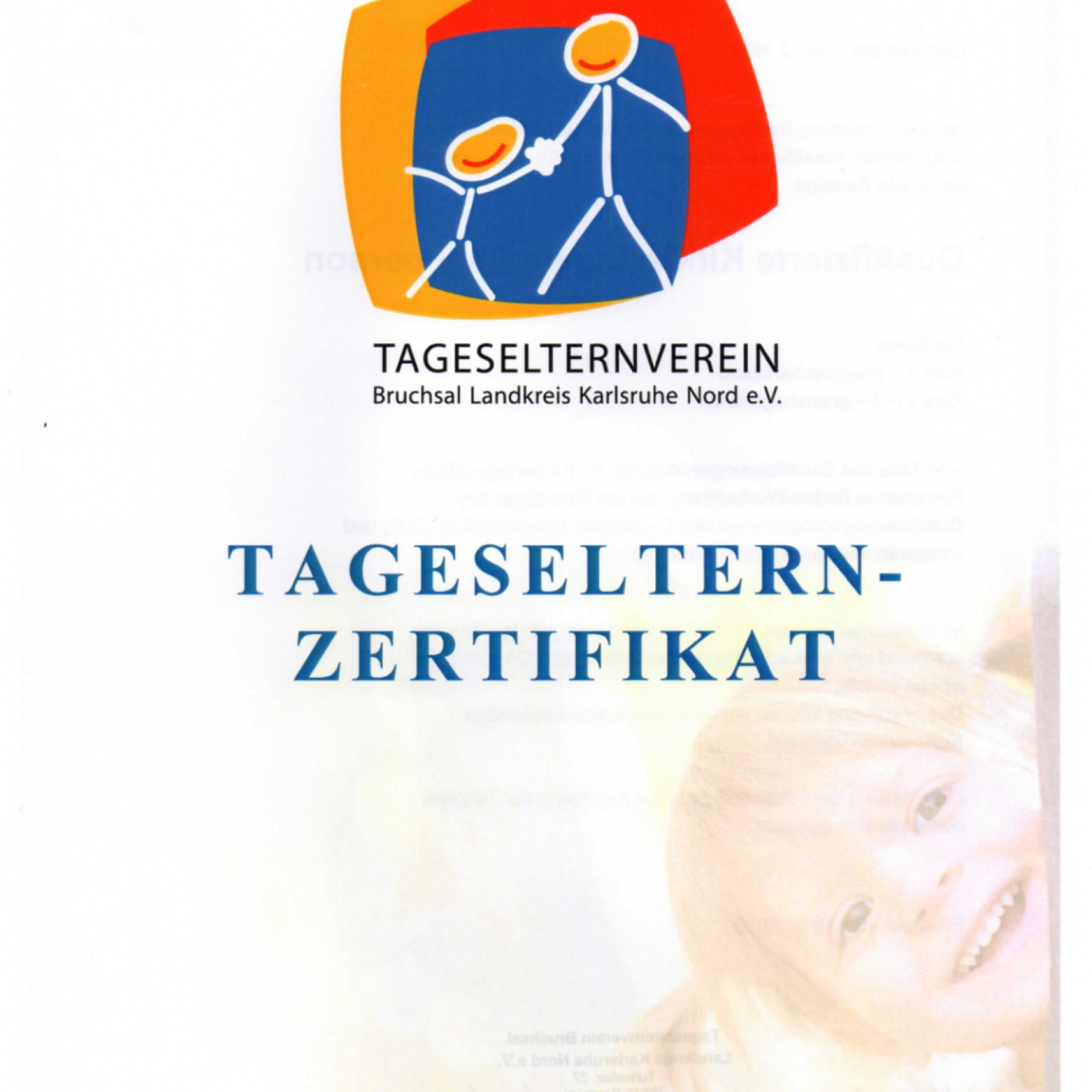 Ich arbeite als qualifizierte Tagesmutter, mit einer Pflegeerlaubnis, nach § 43 SGB VIII, ausgestellt vom Landratsamt Karlsruhe, Abteilung Jugendamt, für die Betreuung von fünf Kindern.