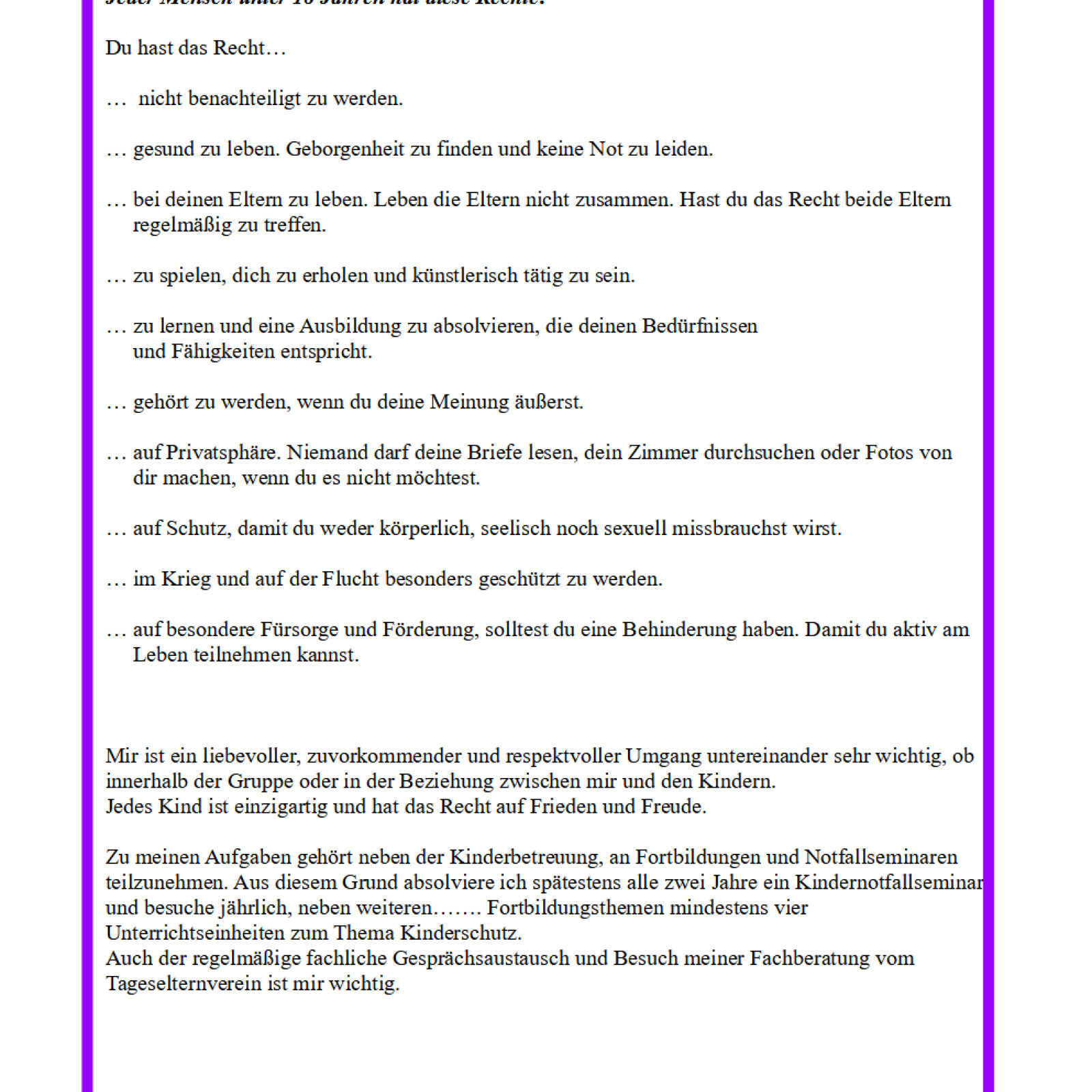 Ich wünsche Ihrem Kind, dass es Freude und Geborgenheit bei mir erlebt, erste Freundschaften schließt und vielfältige Erfahrungen machen kann. Ihnen wünsche ich,